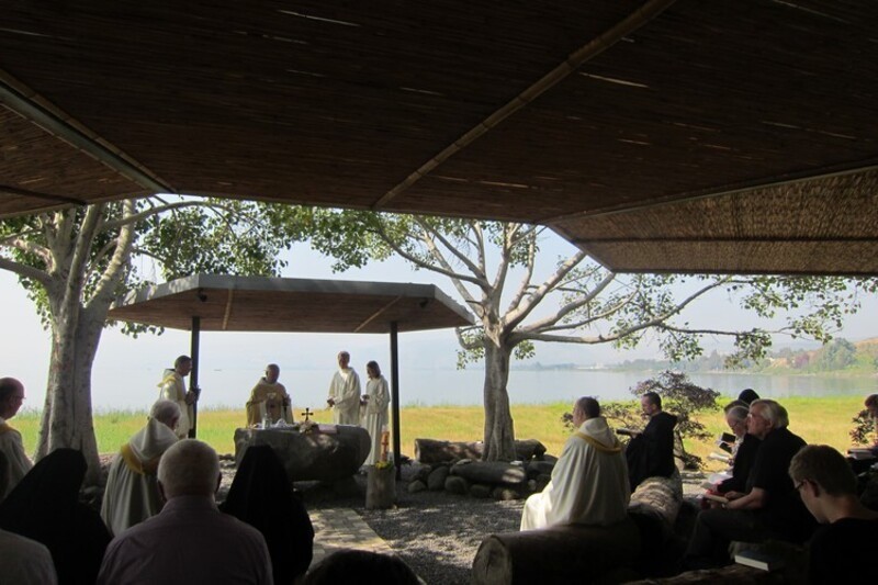 dans les jardins du monastère bénédictin situé sur la rive de la Mer de Galilée.